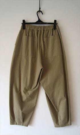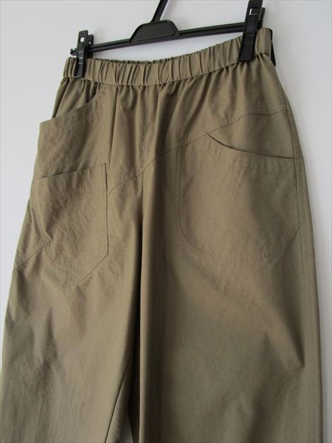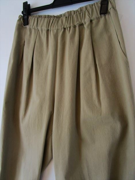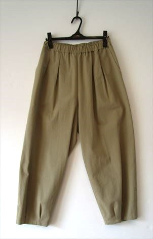 裾をタックで絞ったキャメルベージュのパンツと・・