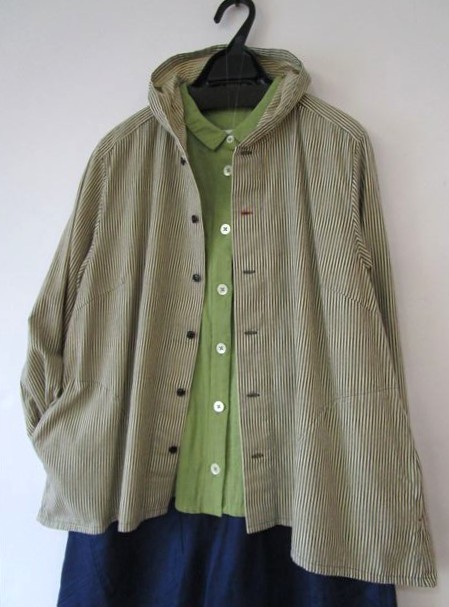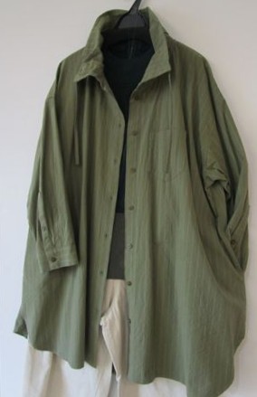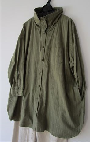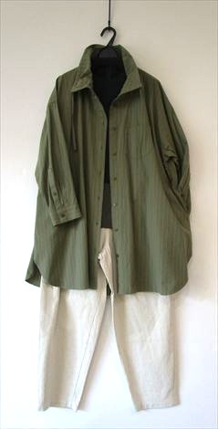 しっかり地厚のコットンワッシャーピンストライプロングブラウスを羽織りました