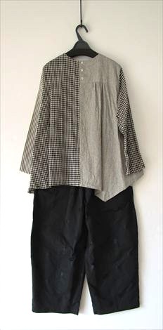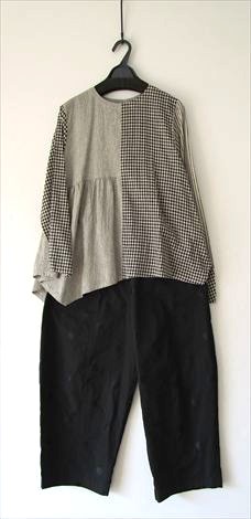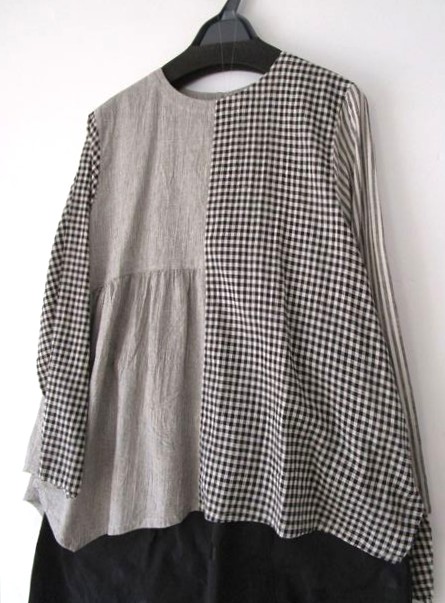 次はカジュアルにモノトーンストライプ・チェックの布帛と黒のカットソーを組み合わせたブラウス