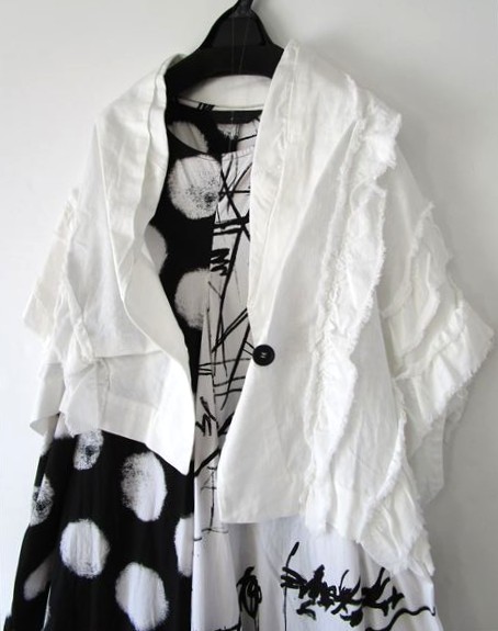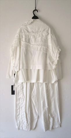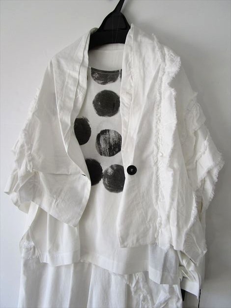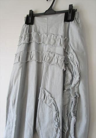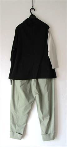 こちらは切りっぱなしのシャーリングテープをふんだんにあしらった綿麻ベストとパンツ
