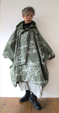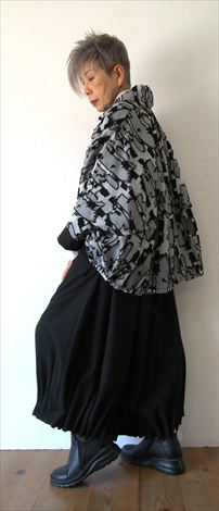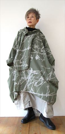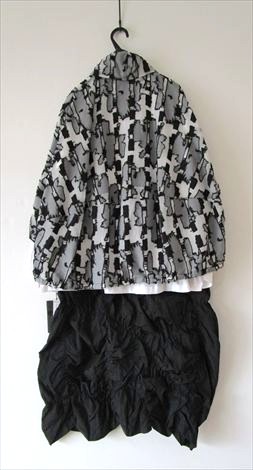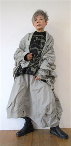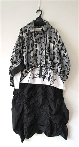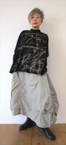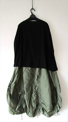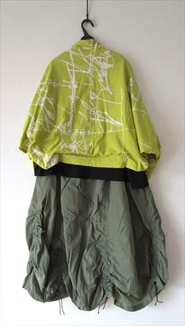 こちらはシャーリングナイロンジャケットとスカートにプリント綿カットソープルオーバーを合わせました