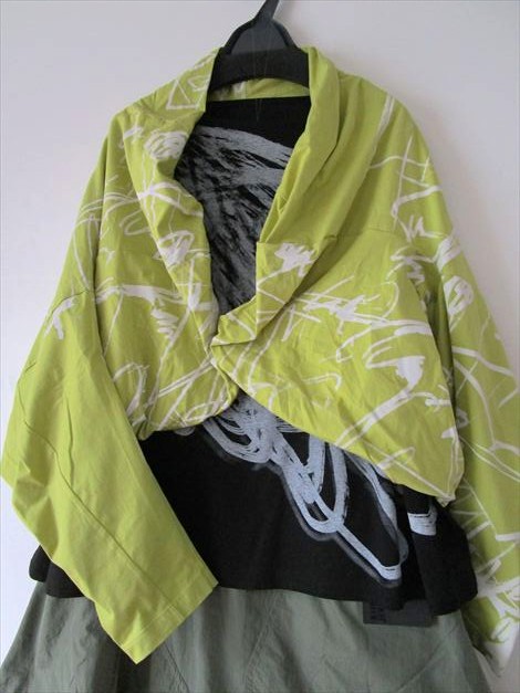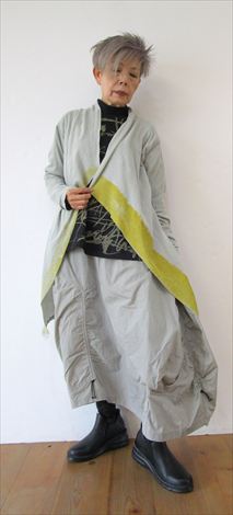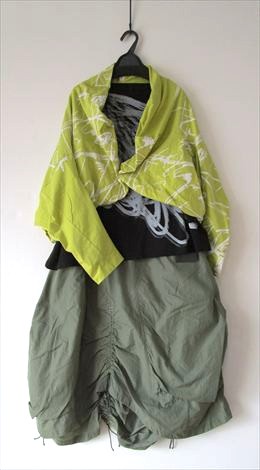もう一色のオリーブグリーンのスカートには黄色のプリントカットソージャケットを合わせました