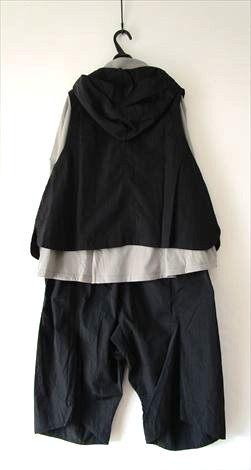 立体的なポケットが特徴のフード襟ベストとパンツ