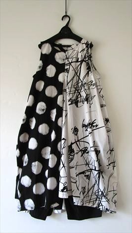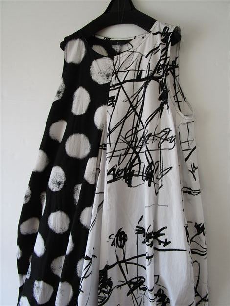 ぼかしドットと抽象柄プリントを左右に使い分けたノースリーブワンピース